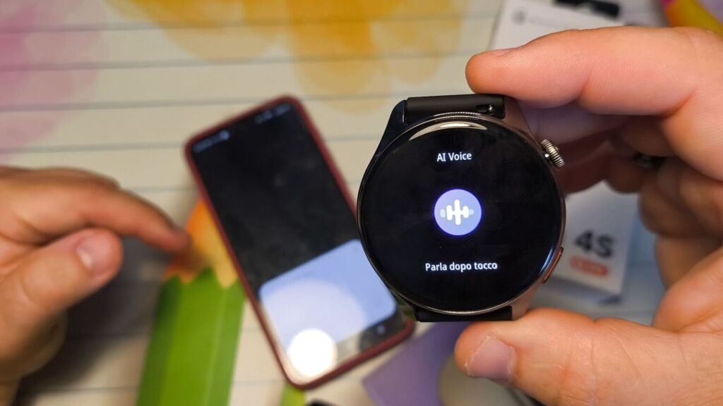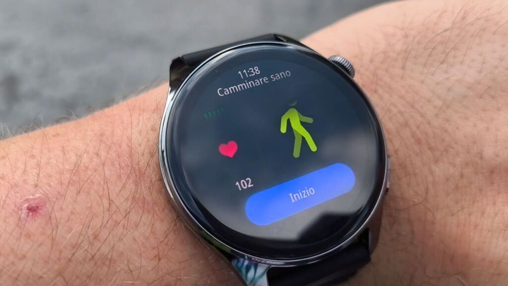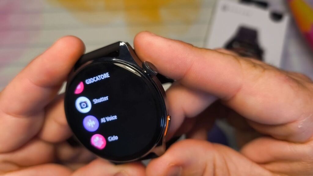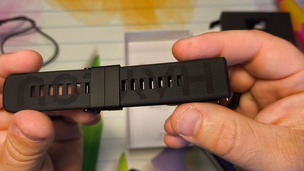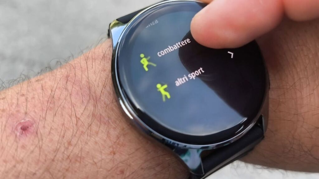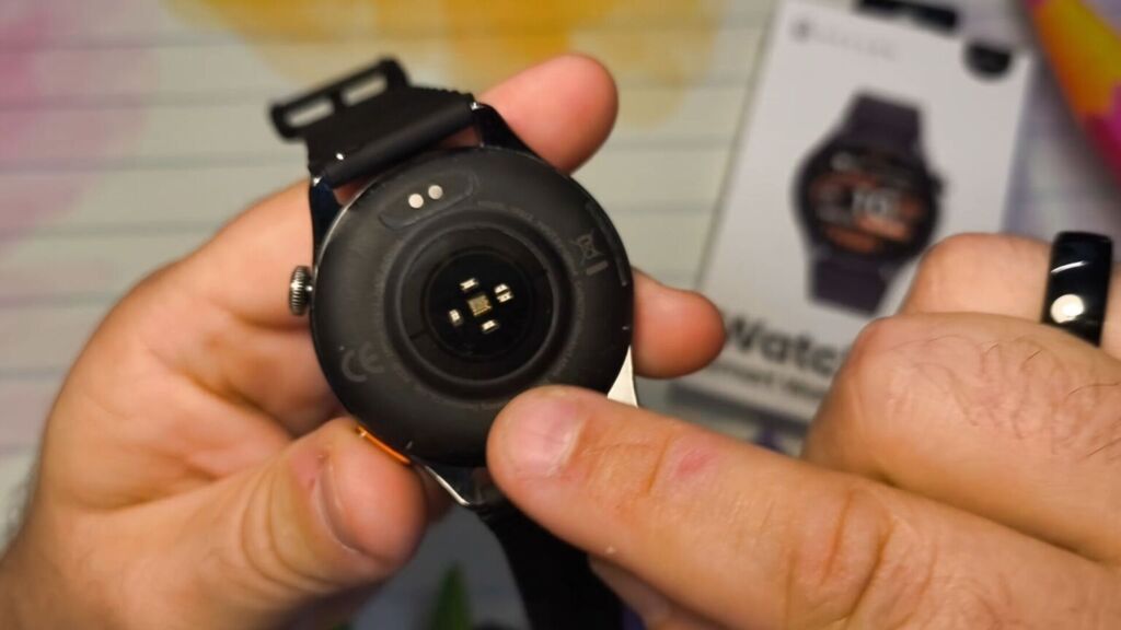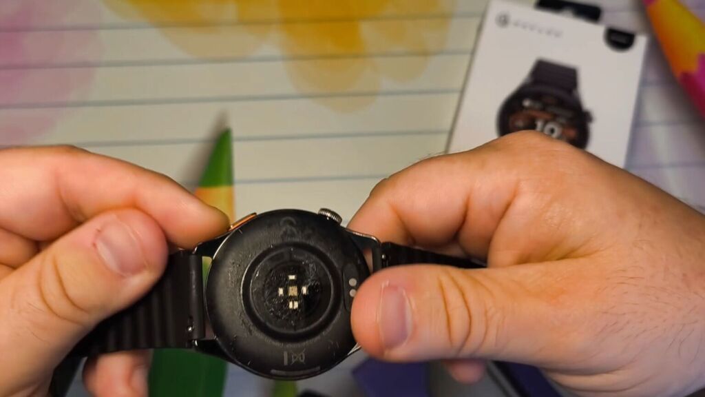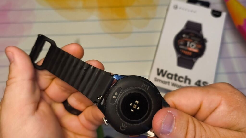 في نهاية القاعدة، بالقرب من الجانب الأيسر، يوجد منفذ الصوت. وفي الأسفل، توجد دبابيس الشحن المغناطيسية وأجهزة الاستشعار التي تراقب صحتك وتمارينك. يتميز هذا الجهاز القابل للارتداء بحزام رئيسي من السيليكون بملمس متموج، مما يوفر شعورًا رائعًا بالثبات والراحة الشاملة. يُضفي الجمع بين الملحق والهيكل مظهرًا أنيقًا للغاية للاستخدام اليومي. ومع ذلك، تتضمن العبوة أيضًا حزامًا إضافيًا، أقل أناقة ولكنه أكثر رياضية. على أي حال، يتميز الجهاز بخاصية فك سريع مقاس 22 مم، ما يتيح لك شراء أحزمة إضافية من جهات خارجية لتصميم مظهر شخصي.